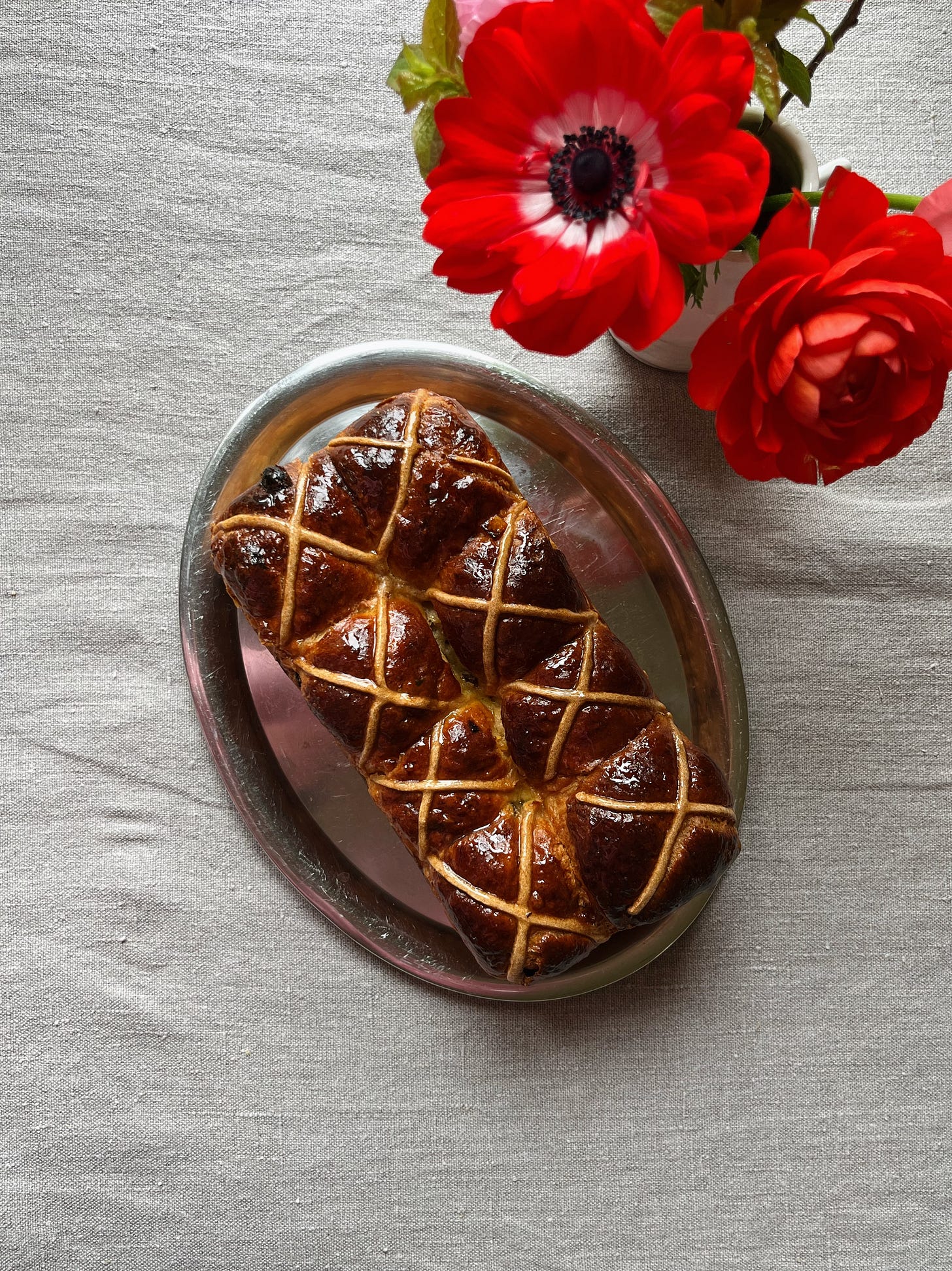 A hot cross loaf felt comforting. I have no memory attached to it, no childhood reference, no ritual. Just the shape, the idea of something spiced, soft, and meant to be shared. But the raisins however, those I know well. They have always found their way into the doughs and cookies I grew up with in Iran, into breads that lean slightly sweet, and into Nowruz cookies that my mom used to make every year.